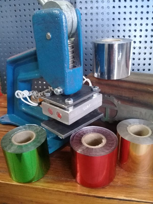 Estampadora para relieve o stamping con color según lo admita el material; área de estampado hasta 50 x 70 mm segun el diseño puede ser para cuero cuerina PU papel carton y PVC
